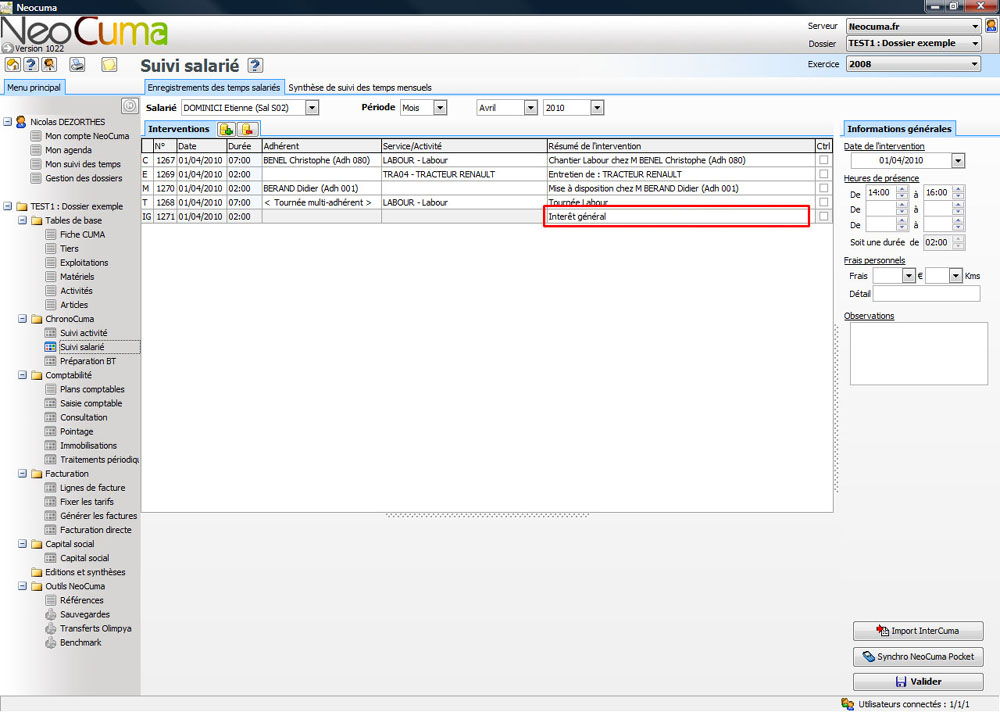 Elles correspondent à des interventions parallèles au fonctionnement de la CUMA : réunion, stage, formations... Vos pouvez changer le libellé résumé de l'intervention pour le rendre plus explicite.
