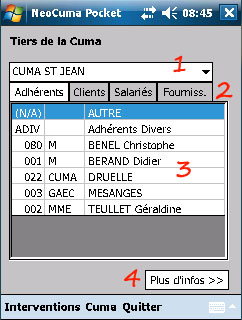 Choisissez le type de tiers de la Cuma que vous souhaitez consulter à l'aide des onglets (2), sélectionnez un tiers dans la grille (3), puis cliquez sur le bouton 'Plus d'infos' (4) pour affichez ses informations détaillées.