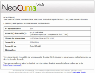 Après chaque demande de réservation, et si l'option de suivi par mail à été activé par les responsables de votre Cuma, vous recevez un email de confirmation de votre demande de réservation :